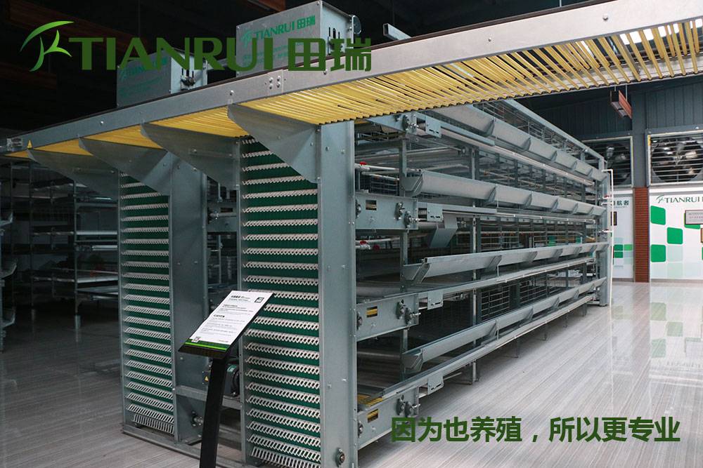 相比第五代层叠式蛋鸡笼,第六代层新型多层大笼位蛋鸡笼,采用窄底大斜坡食槽,利于鸡只采食,节省饲料;鸡只笼位494平方厘米,单笼养鸡17只,一组4个笼位,养鸡68羽;层距加高,利于通风、光照,鸡群活动空间大。